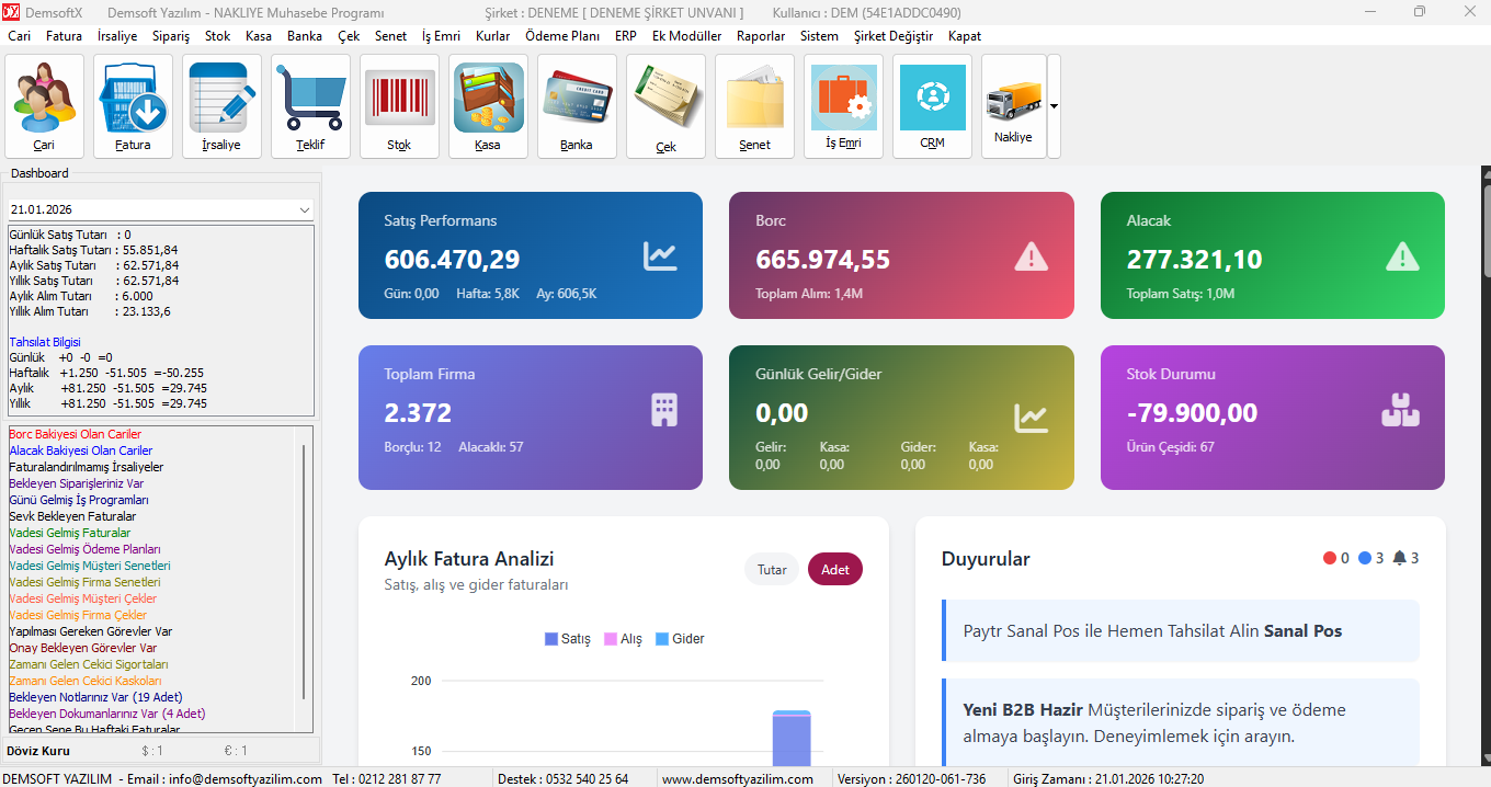 Siparişten tahsilata, müşteri ilişkilerinden personel takibine kadar her şey... Artı, eksiksiz bir muhasebe. E-fatura uyumlu, bulut tabanlı, sektöre özel bir lojistik yönetim çözümü. Stoktan gümrüğe, filo masraflarından ödeme planlarına kadar işletmenizi profesyonelce yönetin.