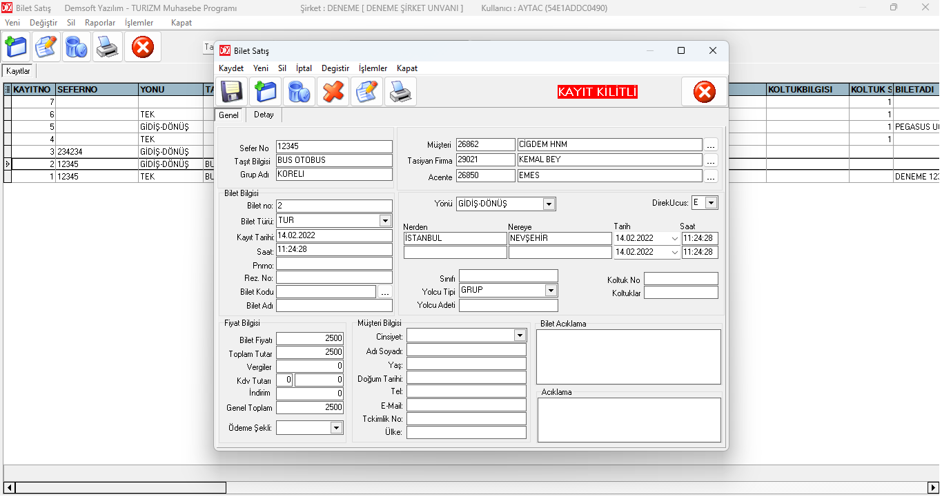 Bilet satış modülünde tüm bilet işlemlerini tek modül üzerinden işleme imkanı vermektedir. toplu bilet listesi yada tek bilet çıktısı verebilirsiniz.