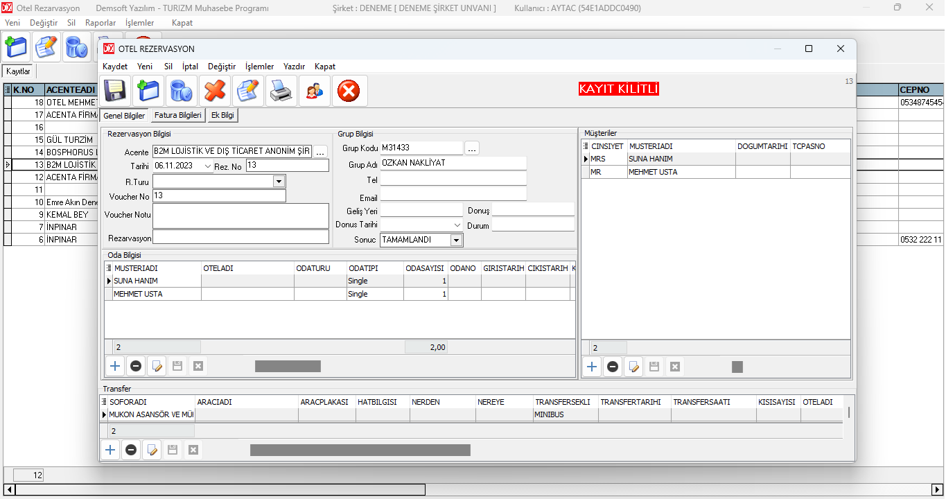 Programımız ile otel rezervasyonu oluşturabilirsiniz. Bu rezarvasyon bilgileri içine sınırsız misafir bilgisi, onlara ait oda bilgilerini işleme imkanı sunar. Yien bu rezervasyona Misafirlerin transfer işlemini ekleyebilirsiniz.