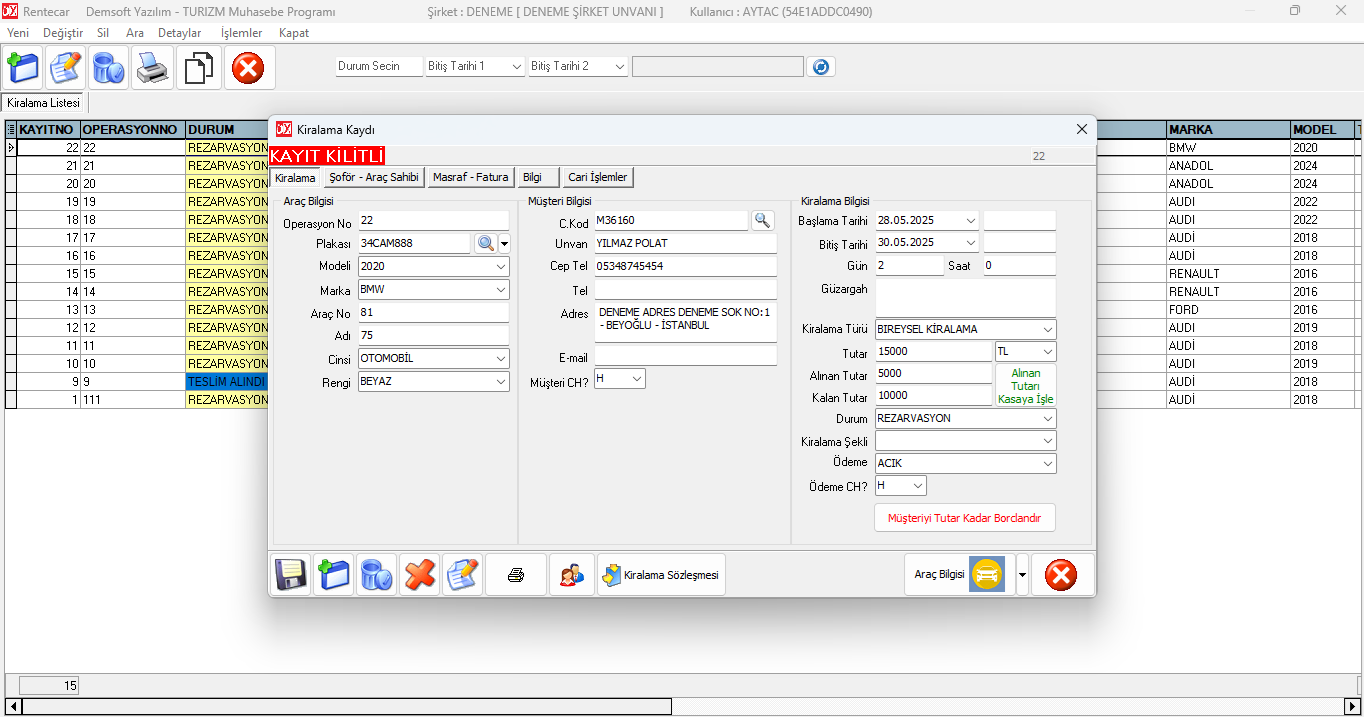Araç Kıralama modülünde kendi özmal araçlarını gireceğiniz bir modul vardır. Kirama ekranında aracı secip, müşterinizi belirttikten sonra kirama işlemini hızlı bir şekilde yapabilirsiniz. Aracı farklı bir yerden alıp kiralama, şöförlü kiralama, kiralama esnasındaki masraflar gibi birçok işlemi ekran üzeriden yapabilirsiniz.