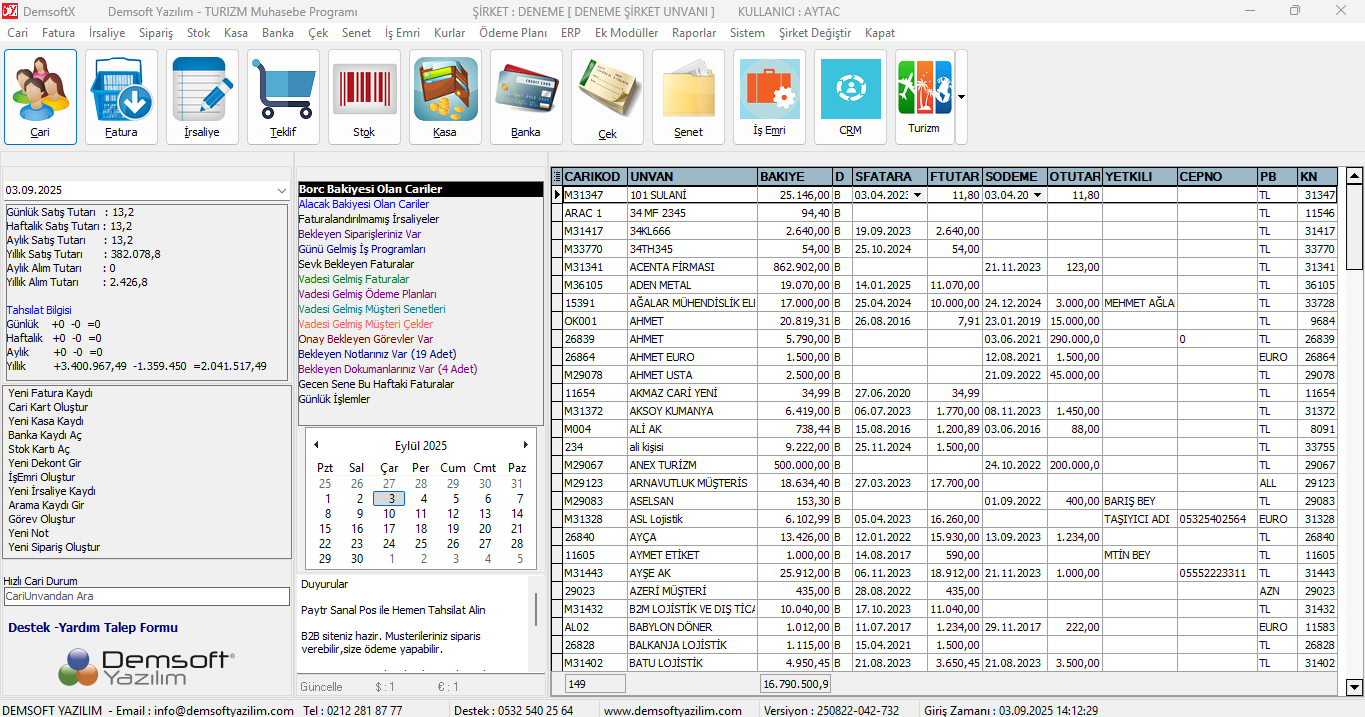 Cari kartları acarken iletişim bilgilerinden, banka bilgisine kadar tüm bilgilerini girebilir, özel kod alanları ile ayrıca istediğiniz gruplamaları yapabilirsiniz. Cari hareket olarak devir ve virman işlemleri, borç-alacak dekontları girebilirsiniz. Cari arama-bulma işlemlerini girilen tüm kriterlerle yapabilirsiniz. Firma yetkilisi ekranı üzerinden cariye ait sınırsız yetkili, birim, departman girebilirsiniz. E-fatura mükellef sorgulamasını vergi no üzerinden onlıne yapar ve cari unvan ve posta kutusunu ilgili alanlara getirir. TC Kimlik no doğruluk kontrolü yapar. Cariye göre iskonto, vade, KDV, kredi, para birimi, otomatik stok kartı, fiyat türü tanımlayabilirsiniz. Cari karta resim ekleyebilirsiniz. Cari kartın müşteri analizini anlık alabilirsiniz. Yine tüm müşterilerinizin analizini program otomatik çıkartır. Cari hareket ekranında farklı ekstra türlerinden çıktılar alabilir, pdf, mail ve excel olarak dışarıya aktarabilirsiniz. Müşterinize özel web linki oluşturarak kendi cari hareketini onlıne görmesini sağlayabilirsiniz. Cari liste ekranında hızlı bir şekilde borç- alacak listesi çıkartabilirsiniz. Yine bu ekran üzerinden bakiye kapama işlemlerini yapabilirsiniz. Tüm şirketlerde aldığı tüm ürünlere tek tuşla ulaşma imkanı sağlamaktayız. Cariye sınırsız evrak-dosya ekleme ve not gitme imkanınız vardır. SMS gönderebilirsiniz. Cep telefonuna hızlı Whatsapp bağlantısı oluşturmaktadır. Cariler arasında virman işlemini yapabilirsiniz.